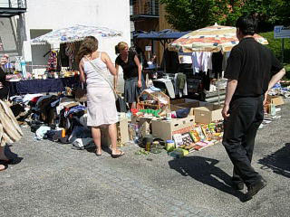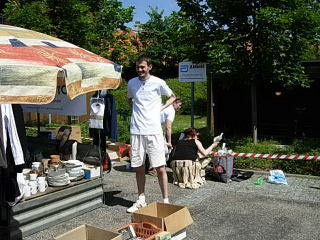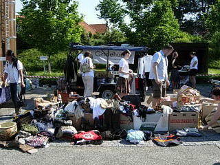Dagen startede tidligt søndag morgen kl 7, hvor vi mødtes bag ved Gentofte Station for at stille boden op med de mange mange ting og sager. Selvom vi var kommet tidligt var der ikke flere borde tilbage, så en nabo til os forbarmede sig og lånte os sin trailer, som vi kunne bruge som bord bagerst i boden. Vi kunne nok ha' brugt en lille pavillion, for solen stegte godt på os - hele dagen - så måske vi skal ofre 100 kr på sådan en til næste gang.