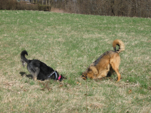 Både Lola og Nougat elsker at grave efter mus på markerne.