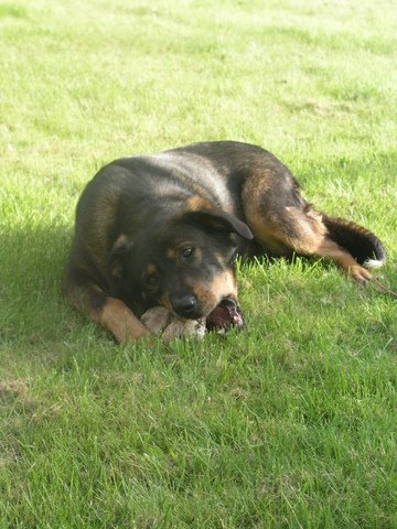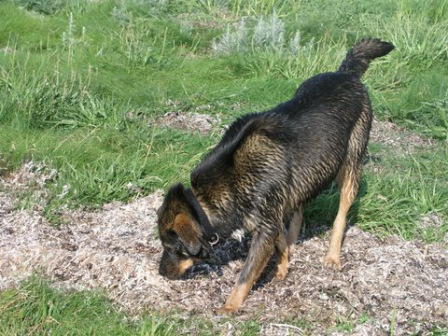 Den første time lå hun ude på gæstetoilettet, men pludselig løb hun ud i haven, legede med Bamse og fandt et gammelt kødben.
