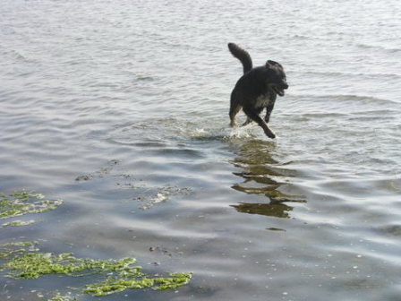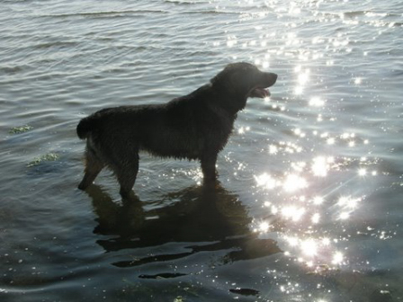 Nu går vi til stranden hver dag, og hun pisker ud sammen med Bamse. Det er en ren fornøjelse. Faktisk er hun blevet så glad for vand, at hver hun ser en pyt, skal hun hen og ligge i den.