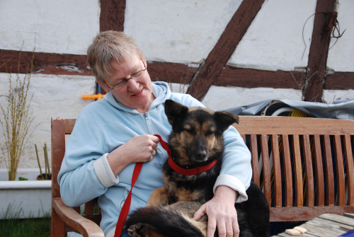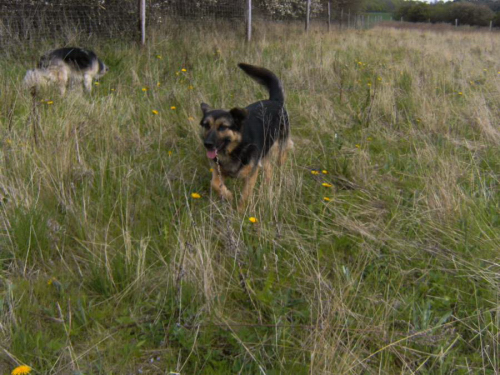 De første 3 uger spiste Olga ca. 3 gange så meget som de andre hundebasser. Hun er vokset, både i størrelse og tykkelse.Hun har mindst taget 5 kilo på og det har pyntet på den lille frøken Olga. Der gik ikke mange dage før hun syntes, det var dejligt at blive kælet for og der midt i sengen var rart at ligge om natten. På den korte tid ,der er gået, har Olga fundet sit jeg frem fra dybet. Hun er lykkelig. Vi kan næsten høre hende råbe jubiiiiiii, når hun kommer styrtende over marken. Den sidste uges tid er hun begyndt at lege meget med Ditte og Susi. Det er helt vidunderligt, at se dem tosse rundt, falde over hinanden og som på et af billederne, bide hinanden kærligt i benene. Hun er faldet så godt til her hos os. Jeg beundrer alle mine andre hunde for, at have taget så godt imod Olga. De har givet hende lov til næsten alt, ja, selv nærmest at tage maden ud af munden på dem. Olga går så fint i snor og lyder sit navn....næsten.Vi er lykkelige for denne skønne, vidunderlige pige.
