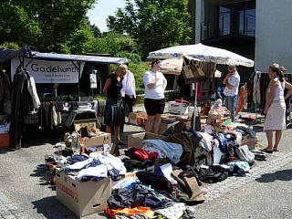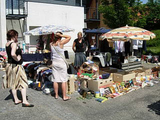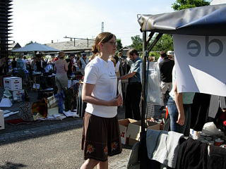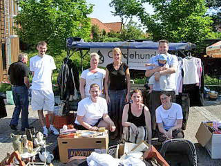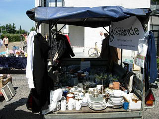 Dagen startede tidligt søndag morgen kl 7, hvor vi mødtes bag ved Gentofte Station for at stille boden op med de mange mange ting og sager. Selvom vi var kommet tidligt var der ikke flere borde tilbage, så en nabo til os forbarmede sig og lånte os sin trailer, som vi kunne bruge som bord bagerst i boden. Vi kunne nok ha' brugt en lille pavillion, for solen stegte godt på os - hele dagen - så måske vi skal ofre 100 kr på sådan en til næste gang.
