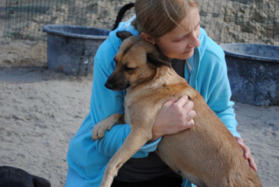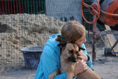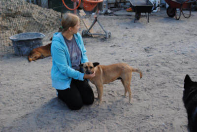 I starten var hun klisteret op af muren og turde ikke kigge på nogen. Det er blevet lidt bedre siden og nu kommer hun forsigtigt over til de frivillige piger, når de kommer på besøg. Hun vil meget gerne aes, men bliver forskrækket ved pludselige bevægelser.