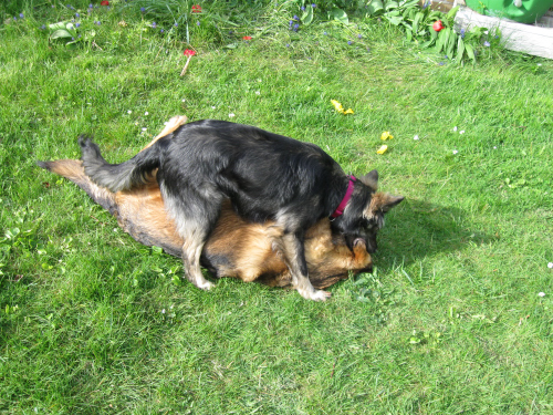 Silke er ikke ligefrem forsigtig i sin leg, hun bider sig godt fast i halsen på Nougat og rusker hende og Nougat finder sig i alt fra den lilles side.De er meget beskyttende overfor hinanden og foretrækker tit at lege med hinanden også når der er andre hunde at lege med.