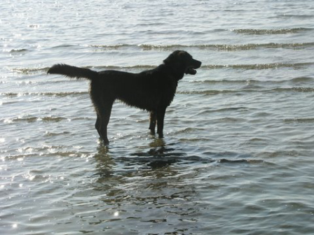 Nu går vi til stranden hver dag, og hun pisker ud sammen med Bamse. Det er en ren fornøjelse. Faktisk er hun blevet så glad for vand, at hver hun ser en pyt, skal hun hen og ligge i den.