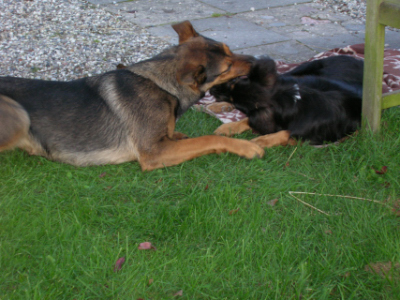 Hun elsker at lege med naboens hund, og det er super dejligt at have en legekammerat så tæt på.
