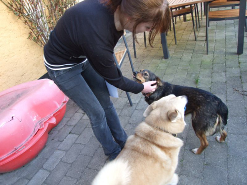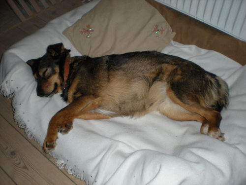Tupka, nu Kiwa, er ved at falde rigtig godt til her hjemme. Hende og Ticko har det super godt med hinanden og leger tit ude i vores have. Hun har dog også sat ham på plads et par gange når han bliver lidt for overstadig, det siger han ikke så meget til, men indordner sig bare efter hende ;) Hun har også overtaget hans hundekurv så hun føler sig ret godt hjemme allerede ;p Så må vi se at få købt en magen til. Hun er virkelig sød og har charmeret sig ind i hjerterne på os alle sammen. I starten forstod vi ikke hvorfor hun ikke kom ind i stuen når vi sad og så fjernsyn om aften, hun kunne sagtens ligge der inde om dagen, lige indtil vi opdagede at hun kiggede op på fjernsynet (når det var tændt) og så løb ind på Sabrina's værelse. Det var fjernsynet hun ikke kunne li', men nu ligger hun ved siden af os ved sofaen, også når der bliver set fjernsyn. Hun har også været renlig lige siden hun kom her, ikke en gang er det gået galt.