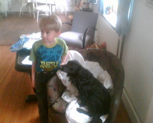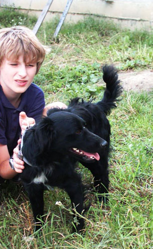 13.07.08 "Her er en lille hilsen fra os og Czar. Det går fremragende godt med Czar, han er bare så sød og så god. Vi er så glad for ham. Alt har gået efter bogen, han er faldet godt til. Han sover med mig om aften, og mens jeg er på arbejde vågter han Finn mens han sover (Finn arbejder på nathold). Han går pænt i snor og spiser godt. Som han har faldt til har der kommet mere og mere liv i Czar, nu er han en dejlig legesyg og frisk hund der er glad for de lange tur vi tager. Han har haft lidt angst i starten især om natten hvor vi hurtig lærte at trække gardinerne for, da han ikke kan lide spejlningen i vinduerne. Men ellers har der ikke været noget. Han elsker børn og var så glad da Emil kom på weekend i dag. Jeg har vedlagt et billede af dem. Jeg skal til London fra Søndag til Torsdag - tænken om at være uden Czar for 4 dage er ikke til at holde ud...