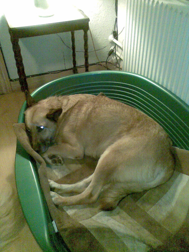Max har indtaget Bunia´s store hundekurv, så store Bunia må tage til takke med Max´s mindre kurv. Hun kan næsten ikke "skrue" sig ned i den, men det rører ikke Max, han bliver troligt liggende i Bunia´s kurv, kigger på hende og tænker "hvordan klarer hun den". Han er en værre frækkert.