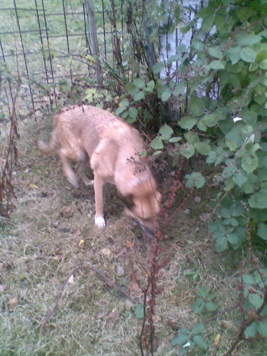 Max er faldet godt til. Han er glad, logrer med halen, ja hele numsen, og virker som om han er en meget tilfreds hund. Han spiser godt, leger med sit pivedyr, guffer hundekiks i sig og nyder bare tilværelsen. Det er så godt at se. Han elsker også de lange gåture over markerne hvor man bare kan rende frit sammen med "tøserne".