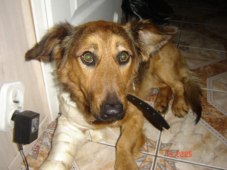 Stakkels Kasper er blevet påkørt af en bil og brækket sit højre forben. Han er blevet opereret da brudet var kompliceret og har nu gibs og bandager på. Han får medicin og ligger på klinikken endnu. Om en uges tid skal dyrlægen lige tjekke op på ham og tage nogle blodprøver. Når han er klar kan han komme hen på hundehotel og fortsætte sin rekreation. Det kostede 1.200 kr for selve operationen og ca 400 kr i medicin. Der kommer yderligere udgifter, når han skal hen på hundehotellet, men det tager vi når det kommer. Vi håber på god respons og om der er nogen der vil hjælpe lidt til i sygekassen.