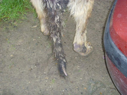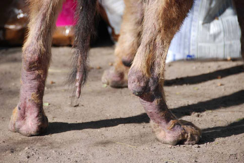 Pelsen er faldet af pga cementen og huden er kraftigt påvirket på benene.
