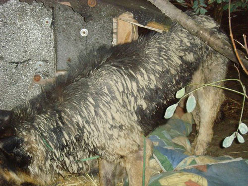 Her ses det tydeligt at pelsen har været smurt ind i cement - hvilke usigelige