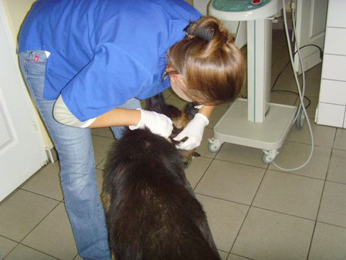 Da de fandt ham var han dehydreret, så det første der blev gjort var at få ham indenfor på internatet og give ham vand og dernæst tjekke ham igennem for sår og skader. Pelsen var fuldstændig indhyldet i tørt cement, hvilket de kæmpede med at få fjernet.